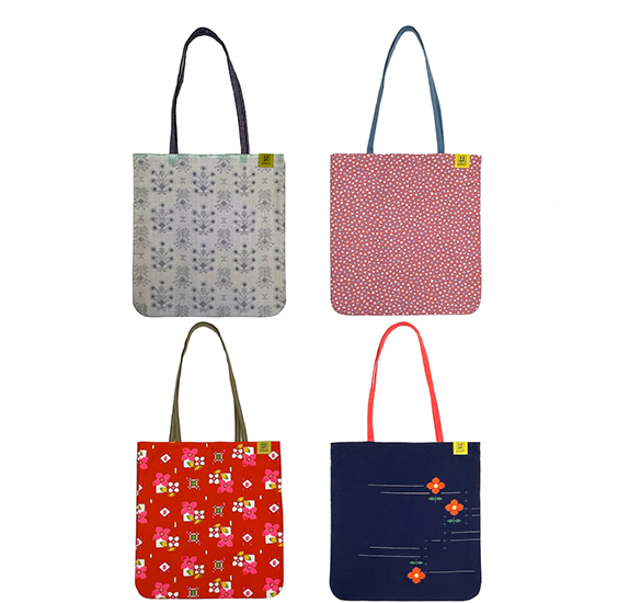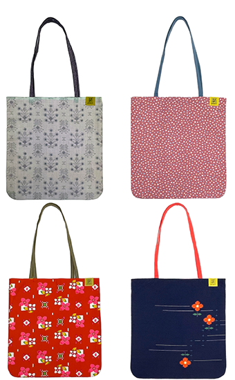 室町呉袋のバッグは、合わせる裏地の素材や色、持ち手の色を変えております。リバーシブルでも使えて、表地、裏地どちらも楽しめます。裏地の色も、表地の生地のデザインの色味に合わせて、全て変更しているので、裏返して使うのも楽しいです。